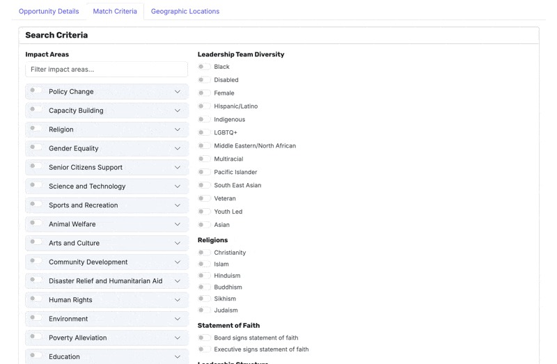 Beyond the standard charity information, you can refine your Giving Opportunity by setting specific focus areas, locations, gift size ranges, and eligibility filters. Narrow the pool by revenue, organization size, leadership diversity, and more.